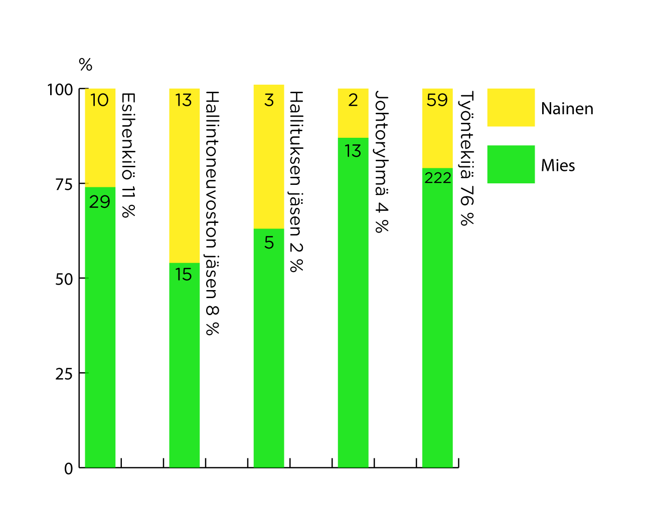 Sukupuolijakauma (työntekijät, esihenkilöt, johtoryhmä, hallitus)