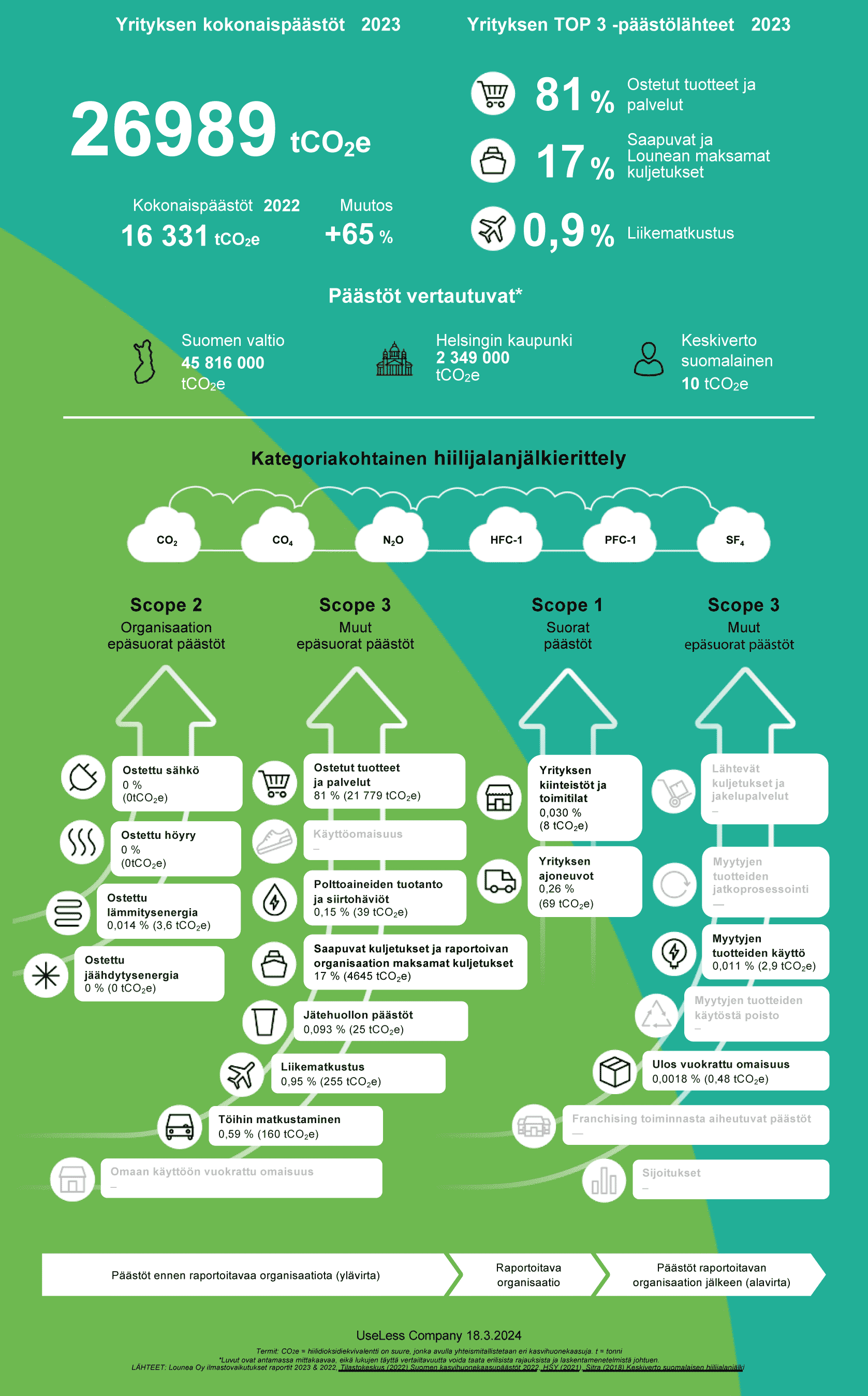 Raportointijakso on 1.1.-31.12.2023. Päästölaskenta sisältää päästöt yrityksen omasta toiminnasta (scope1 ja scope 2) ja kaikki merkittävimmät kategoriat arvoketjusta (scope 3). Organisaation hiilijalanjälki on laskettu GHG Protocol -stardardin vaatimusten mukaisesti, joka määrittää hiilijalanjäljen laskentaperiaatteet ja -menetelmät kullekin laskennan osa-alueelle. Laskennassa on käytetty operatiivisen kontrollin rajausta. Tiedot raportoidaan hankinta ja sijaintiperusteisesti.