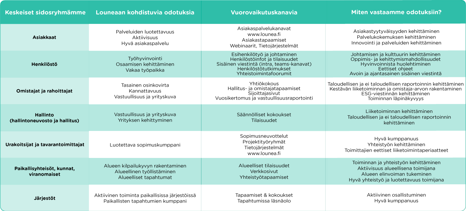Lounean keskeisiä sidosryhmiä asiakkaidemme ja oman henkilöstömme lisäksi ovat omistajamme, joita on yli 17.000, rahoittajat, kumppanimme, viranomaiset, järjestöt sekä päättäjät ja paikallisyhteistyö.