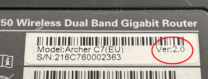 Lataa uusin saatavilla oleva päivitys TP-linkin sivuilta tietokoneellesi. Valitse vasemmasta yläreunasta oikea versionumero, joka täsmää laitteeseesi. Tämän jälkeen paina Firmware -kohtaa ja lataa uusin Archer_C7_**** tiedosto. Laitteen malliversion voi tarkistaa kuvasta näkyvästä kohdasta: