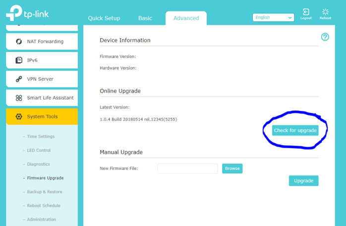 Paina "Check for upgrade" -vaihtoehtoa. Mikäli saatavilla on päivitys, hyväksy päivittäminen painamalla alle ilmestyvää "Upgrade" -vaihtoehtoa. Tämän jälkeen laite päivittää itseään automaattisesti noin 5-10 minuutin ajan ja yhteys palautuu päivityksen jälkeen käyttökuntoon.