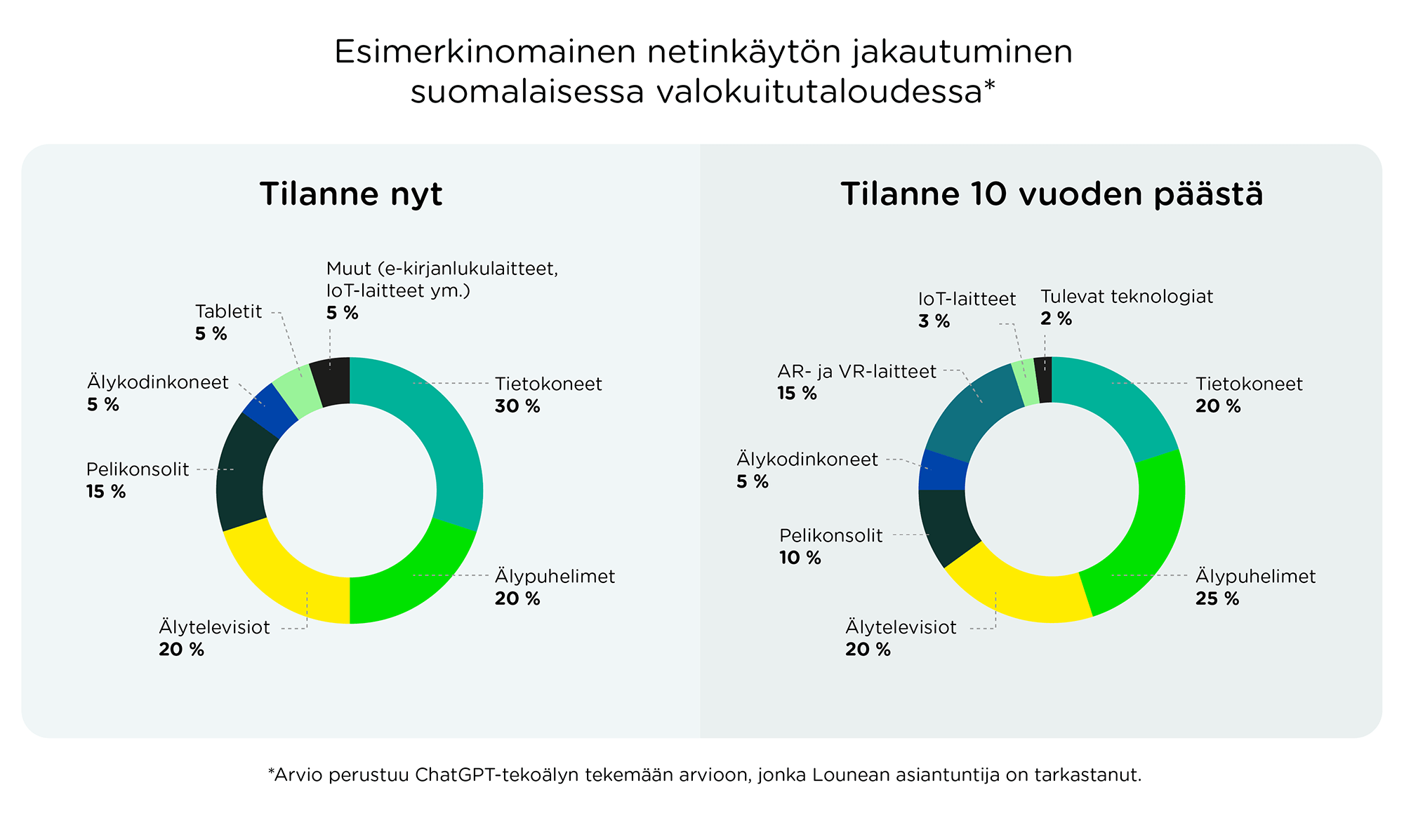 Lisäksi nettiä käyttävien laitteiden määrä lisääntyy kotitalouksissa, kun esimerkiksi lämmönohjaus, turvakamerat, sähköpatterit ja jääkaapit ovat yhä useammin etäohjattavia.