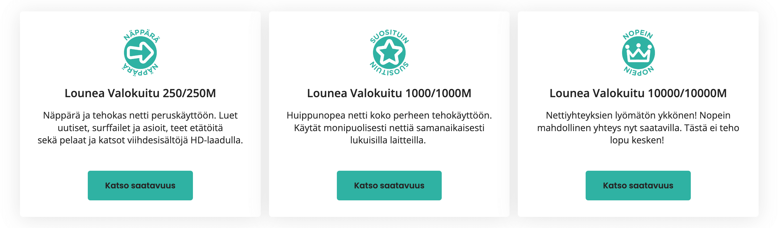 Lounea Valokuitu ratkaisee nettiyhteysasiat vuosikymmeniksi, asutpa sitten omakoti-, rivi- tai kerrostalossa. Tarkista alueesi saatavuus ja tilaa yhteys jo tänään!