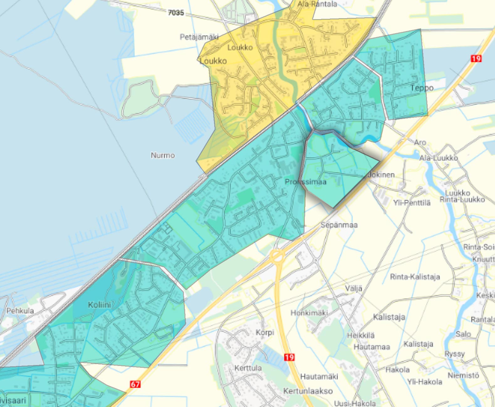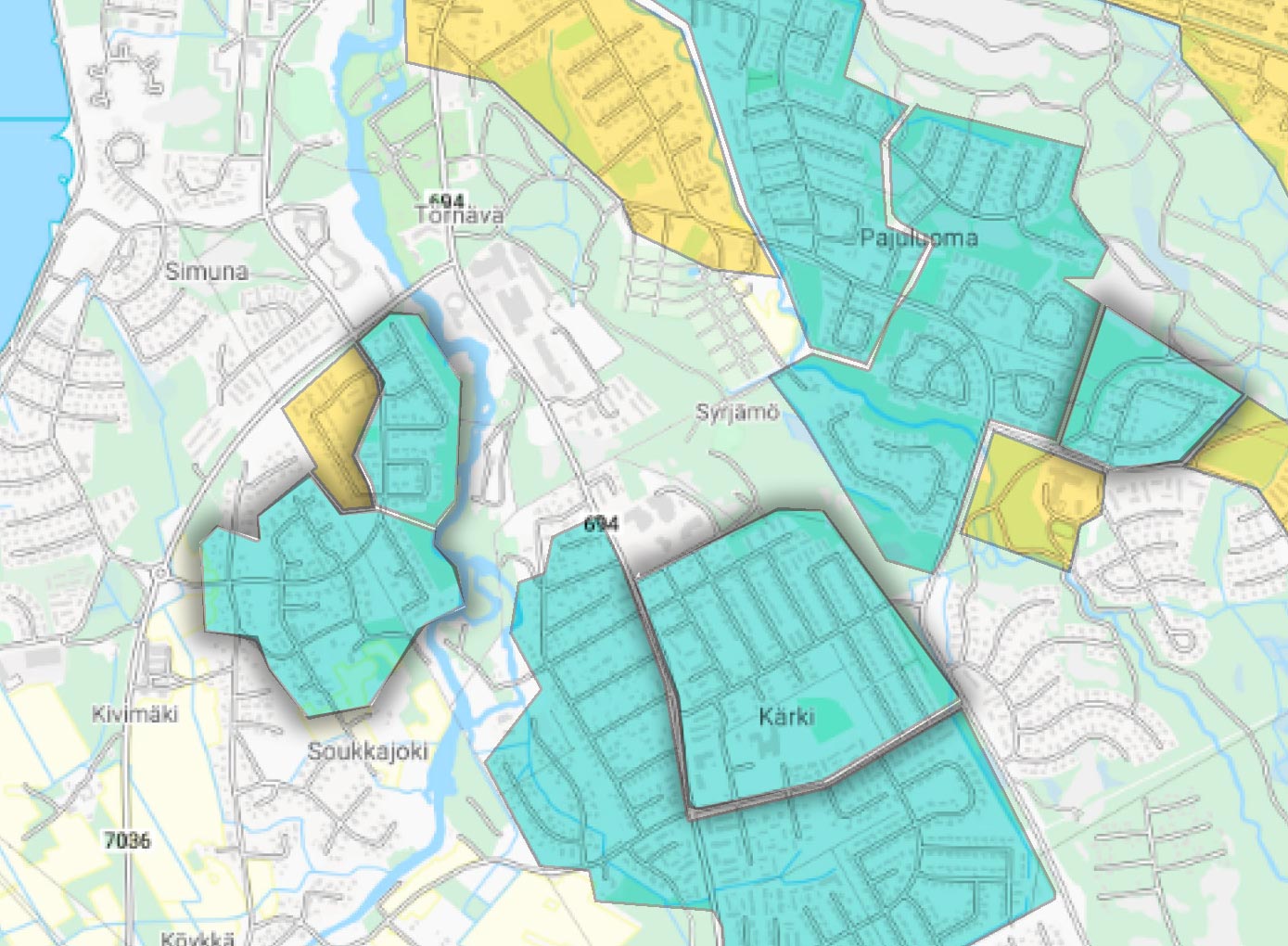Uudet rakennusalueet kartassa sinisellä, muut myynnissä olevat alueet keltaisella: