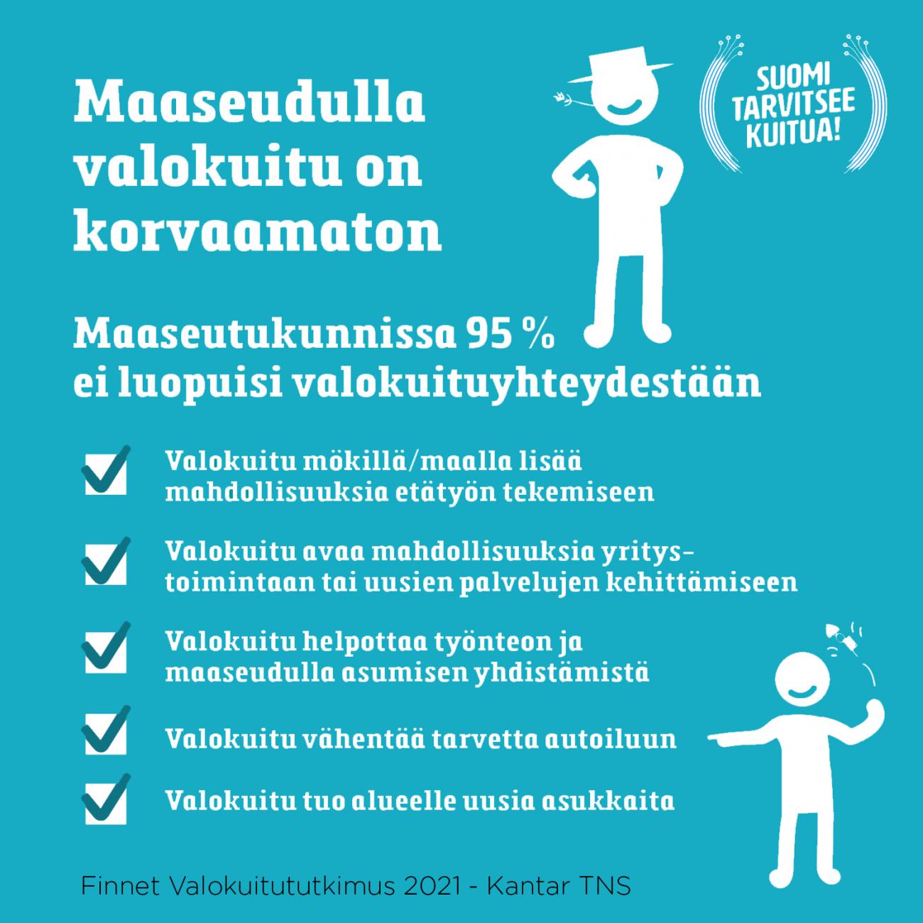 Nykyaikaiset tietoliikenneyhteydet ovat kunnan elinvoiman kannalta ehdoton edellytys. Edes paljon keskusteltuja 5G-yhteyksiä ei ole ilman valokuitua.